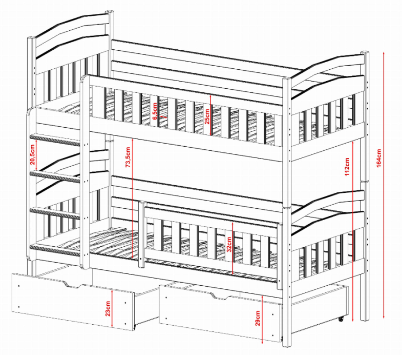 Ljestve se mogu montirati na bilo koju stranu. Ograda za donji krevet se može po potrebi maknuti.