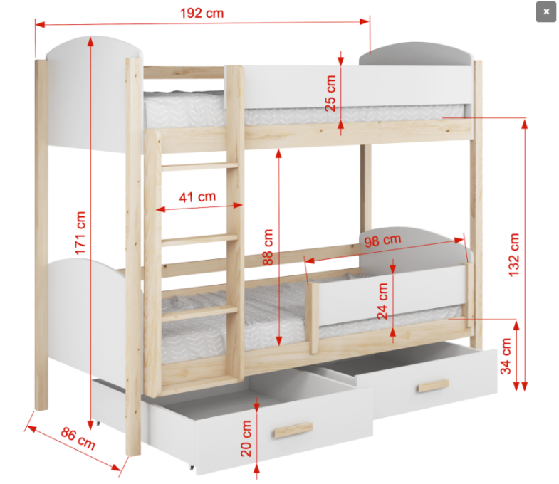 ! VAŽNO ! NA SLICI JE KREVET S LIJEVOM STRANOM. MOLIMO PRILIKOM NARUDŽBE UPISATI NA KOJOJ STRANI ŽELITE STEPENICE.
