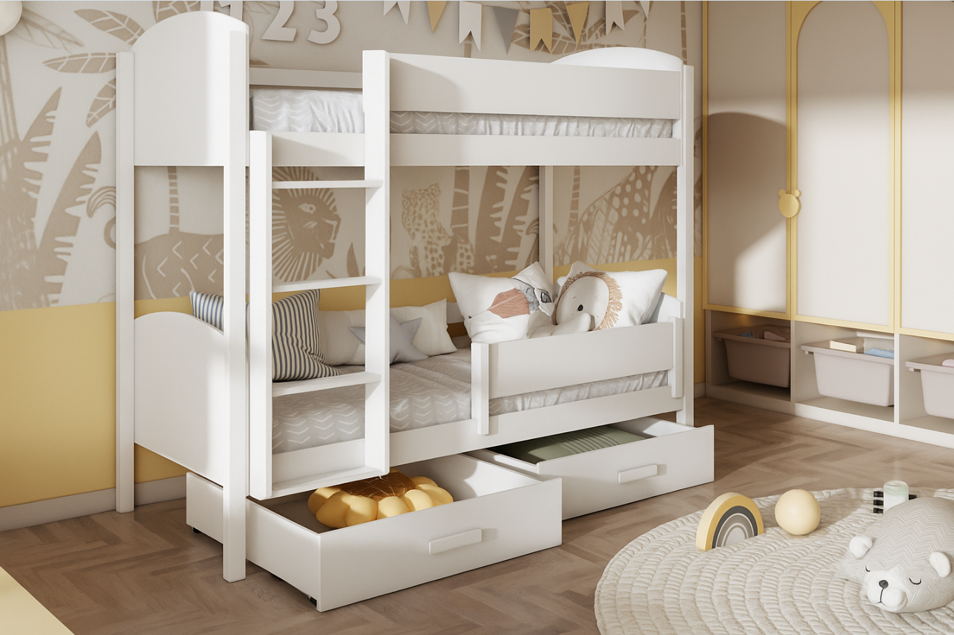 Okviri su zatvoreni, pružajući osjećaj sigurnosti. Ispod donjeg okvira ima dovoljno prostora za pohranu kutija, poput posteljine ili nekorištenih igračaka.