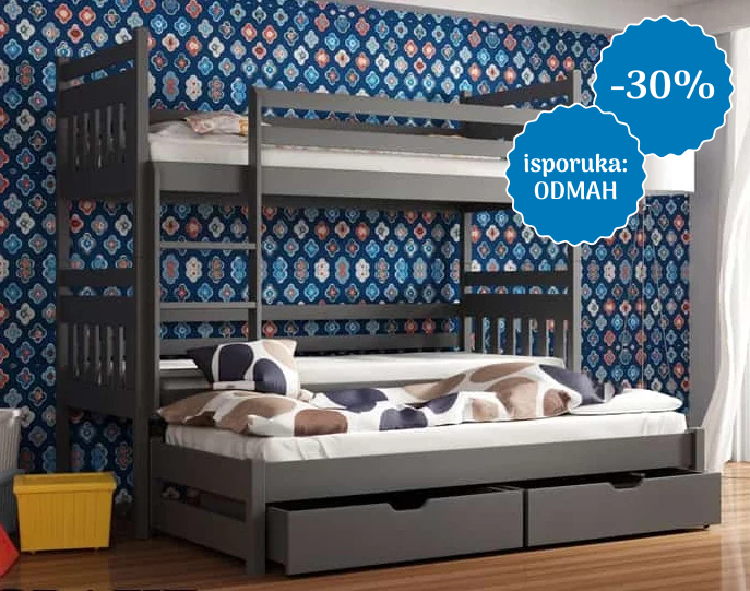 Krevet ima 3 ležišta te je odlično rješenje za one koji cijene funkcionalnost, moderni dizajn i imaju manjak prostora. Završna obrada kod bojanja je na bazi vode te je u skladu s EN 71-3: 2013.
