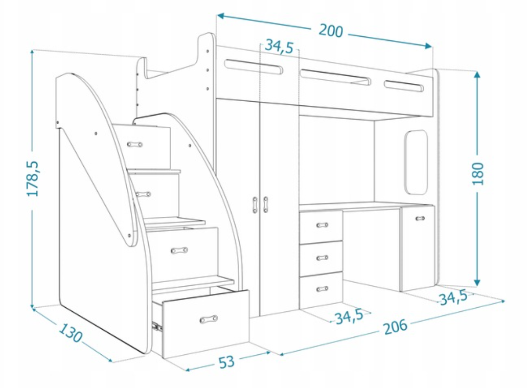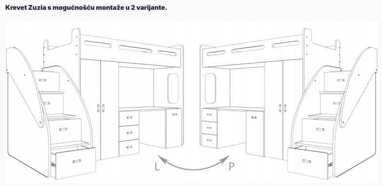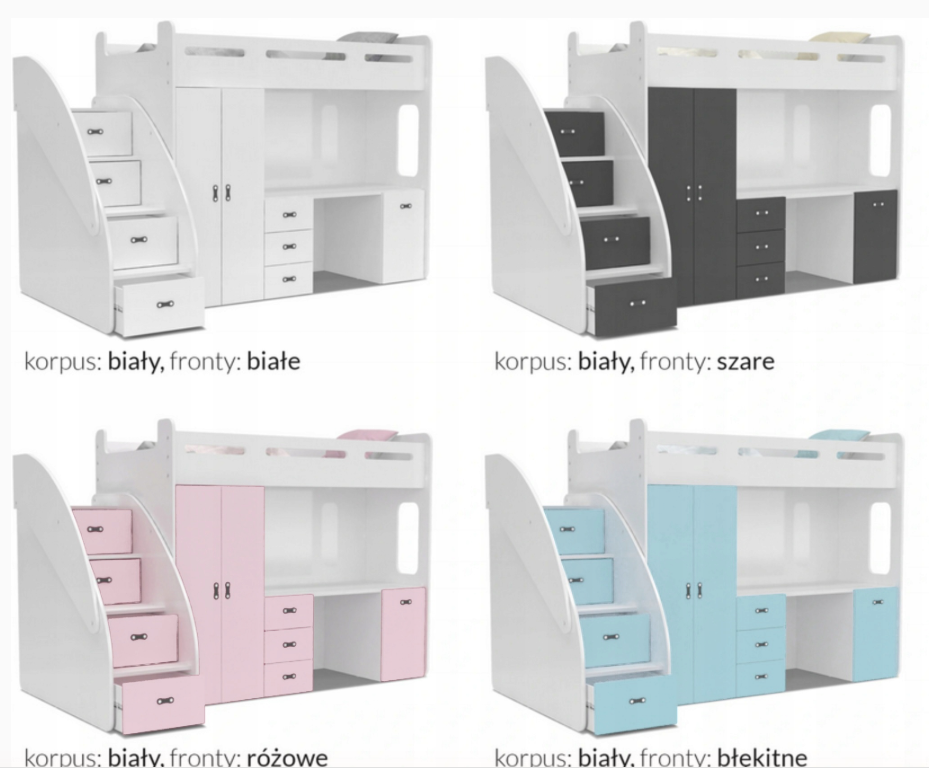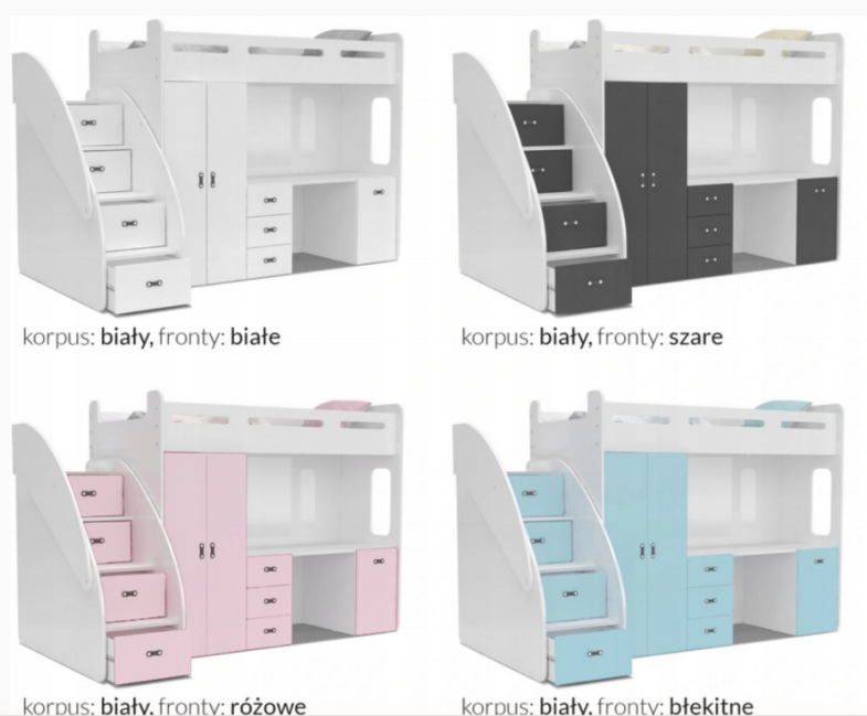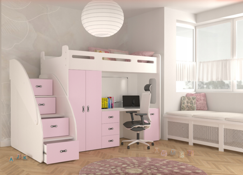 Dječji krevet na kat Zuzia Plus idealno je rješenje za male i mlade kojima treba i mjesto za odmor i prostor za učenje. Gornji ležaj s madracem dimenzija 200x80 cm osigurava udoban san, dok se u donjem dijelu nalazi praktičan radni kutak sa stolom i dodatnim policama za knjige i školski pribor.