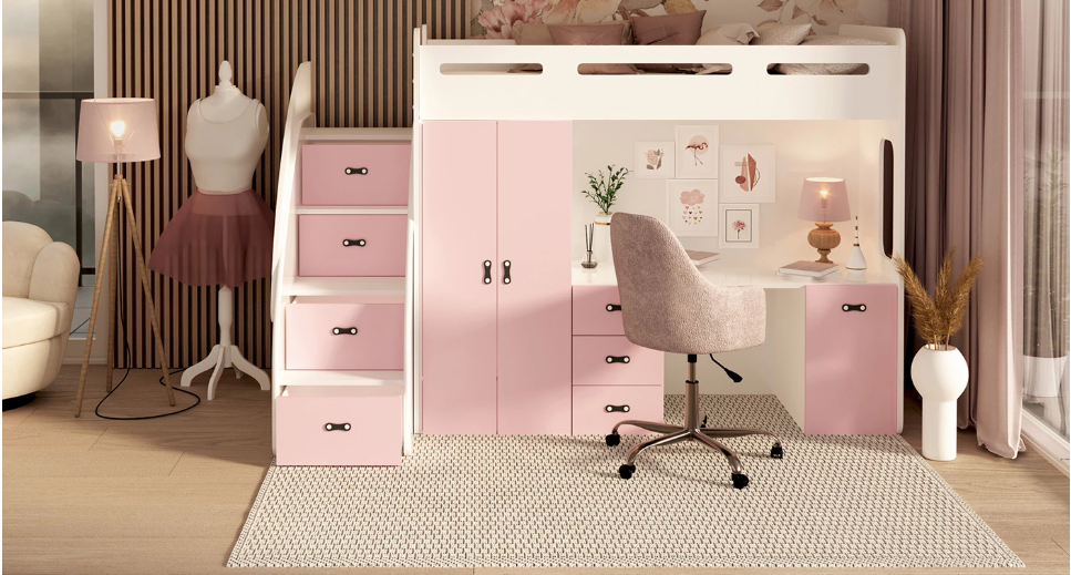 Stepenice koje vode na kat skrivaju ladice, a uz njih dolazi i prostrani ormar te dodatni elementi za pohranu. Sve to omogućava da soba ostane uredna i organizirana.