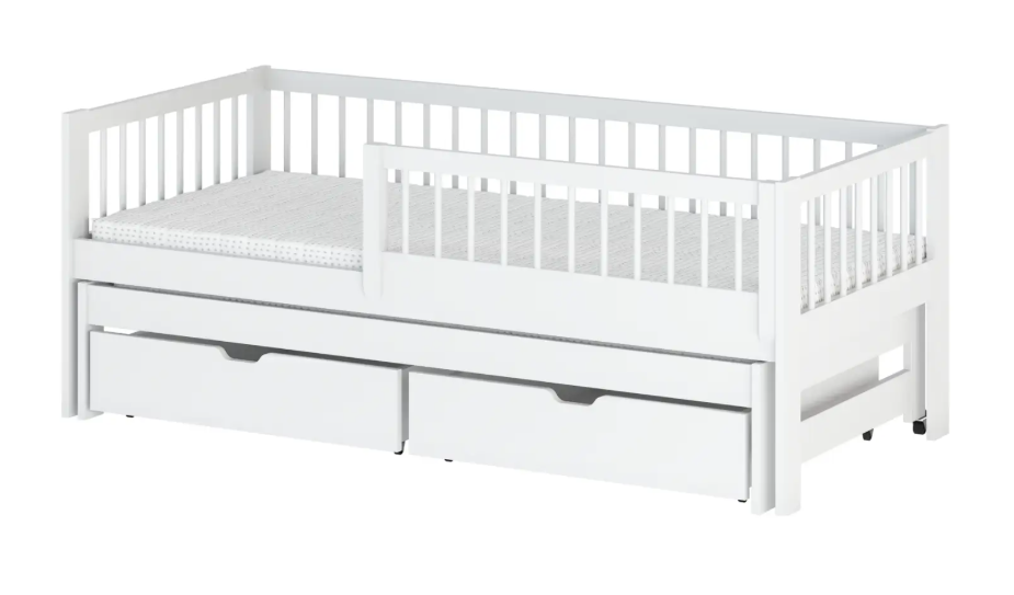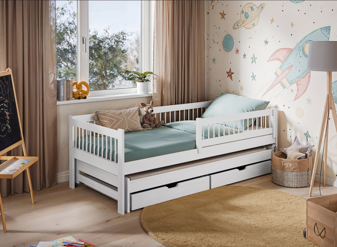Krevet SOFTI je izrađen od punog borovog drveta, obojen lakovima vrlo visoke otpornosti na ogrebotine, dajući istovremeno učinak glatkoće. Završna obrada kod bojanja je na bazi vode te je u skladu s EN 71-3: 2013.