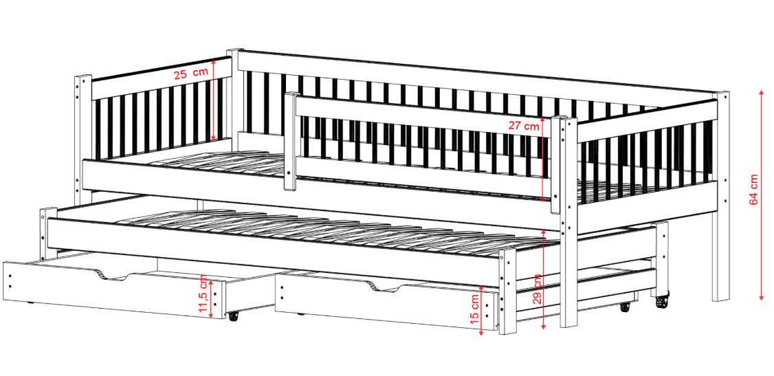 Madrac za dodatni krevet na izvlačenje je 10cm kraći od normalne dimenzije za taj krevet (npr.za dimenziju 200*90 trebaju madraci 1x 200*90cm i 1x 190*90cm.)