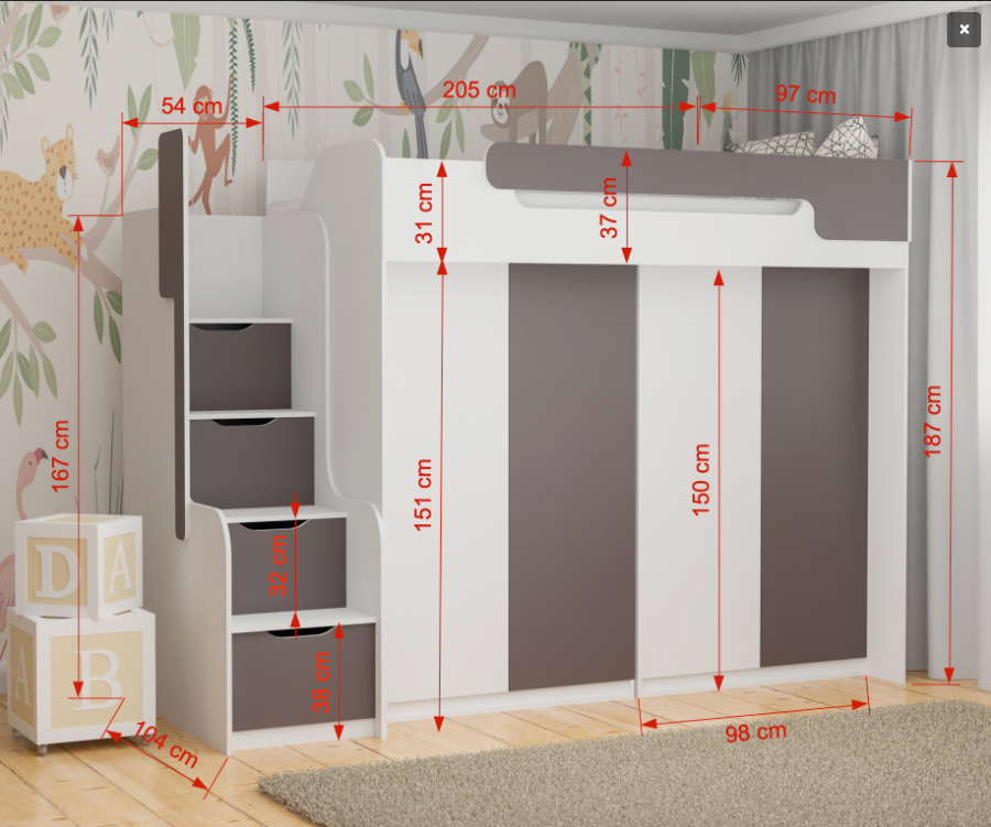 ! VAŽNO ! NA SLICI JE KREVET S LIJEVOM STRANOM. MOLIMO PRILIKOM NARUDŽBE UPISATI NA KOJOJ STRANI ŽELITE STEPENICE.